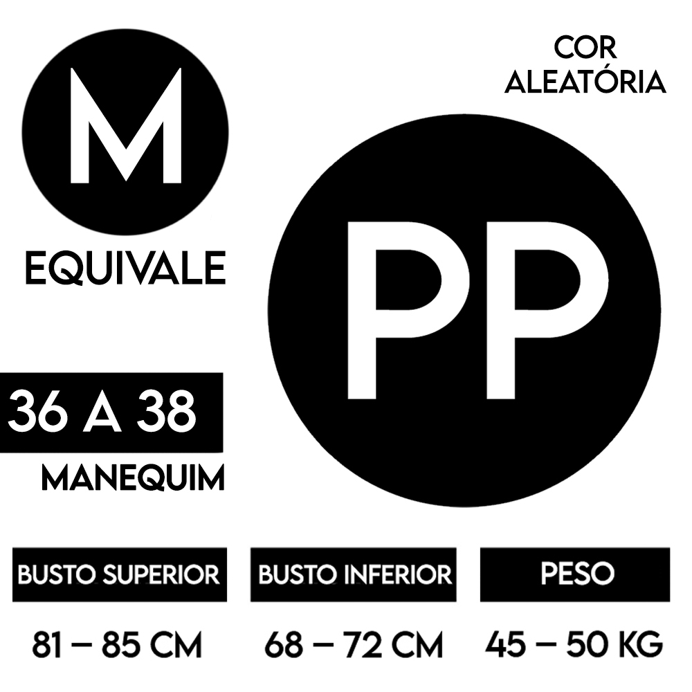 M: Busto Superior: 81 a 85 cm | Busto Inferior: 68 a 72 cm | Peso: 45kg - 50kg